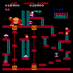 You start off on a platform in the middle of the screen on the far left. At the top of the ladder is an umbrella, which gives you a small points bonus. Next to this structure is an elevator going upwards, and next to that is a small structure with two platforms, two ladders and a flame going up and down them. Time your jump onto the elevator so you can jump onto the ladder platforms without any risk of contact with the flame. Do not get crushed by the elevator when it reaches the top!